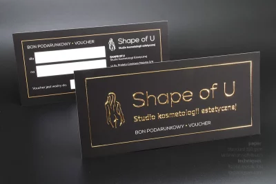 DL size vouchers, weight 350, full colour, soft-touch (nice to touch) laminated on the front. Also metallic relief foil on the front in colour golden.