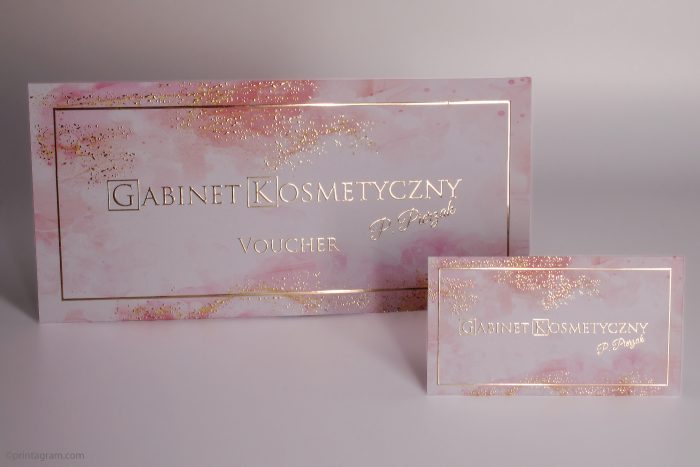 Vouchery wykonane na solidnym papierze kredowym 350g, z dwustronnym drukiem cyfrowym CMYK. Pokryty efektownym, wypukłym złoceniem oraz folią soft-touch, co dodaje niepowtarzalnej elegancji.