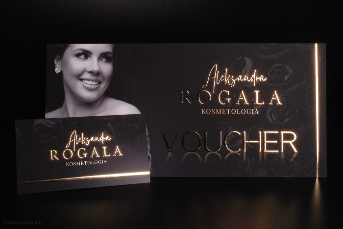 Vouchery wykonane na solidnym papierze kredowym 350g, z dwustronnym drukiem cyfrowym CMYK. Pokryty efektownym, wypukłym złoceniem oraz folią soft-touch, co dodaje niepowtarzalnej elegancji.