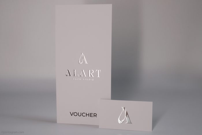 Vouchery wykonane na solidnym papierze kredowym 350g, z dwustronnym drukiem cyfrowym CMYK. Pokryty efektownym, wypukłym srebrzeniem oraz folią soft-touch, co dodaje niepowtarzalnej elegancji.
