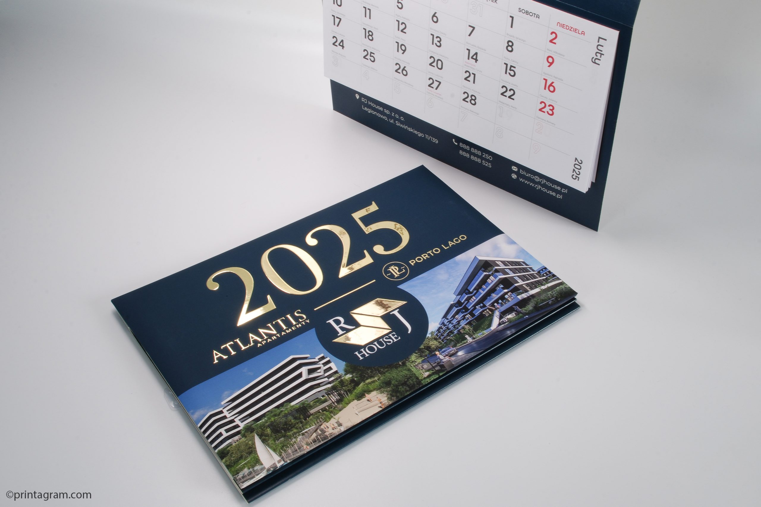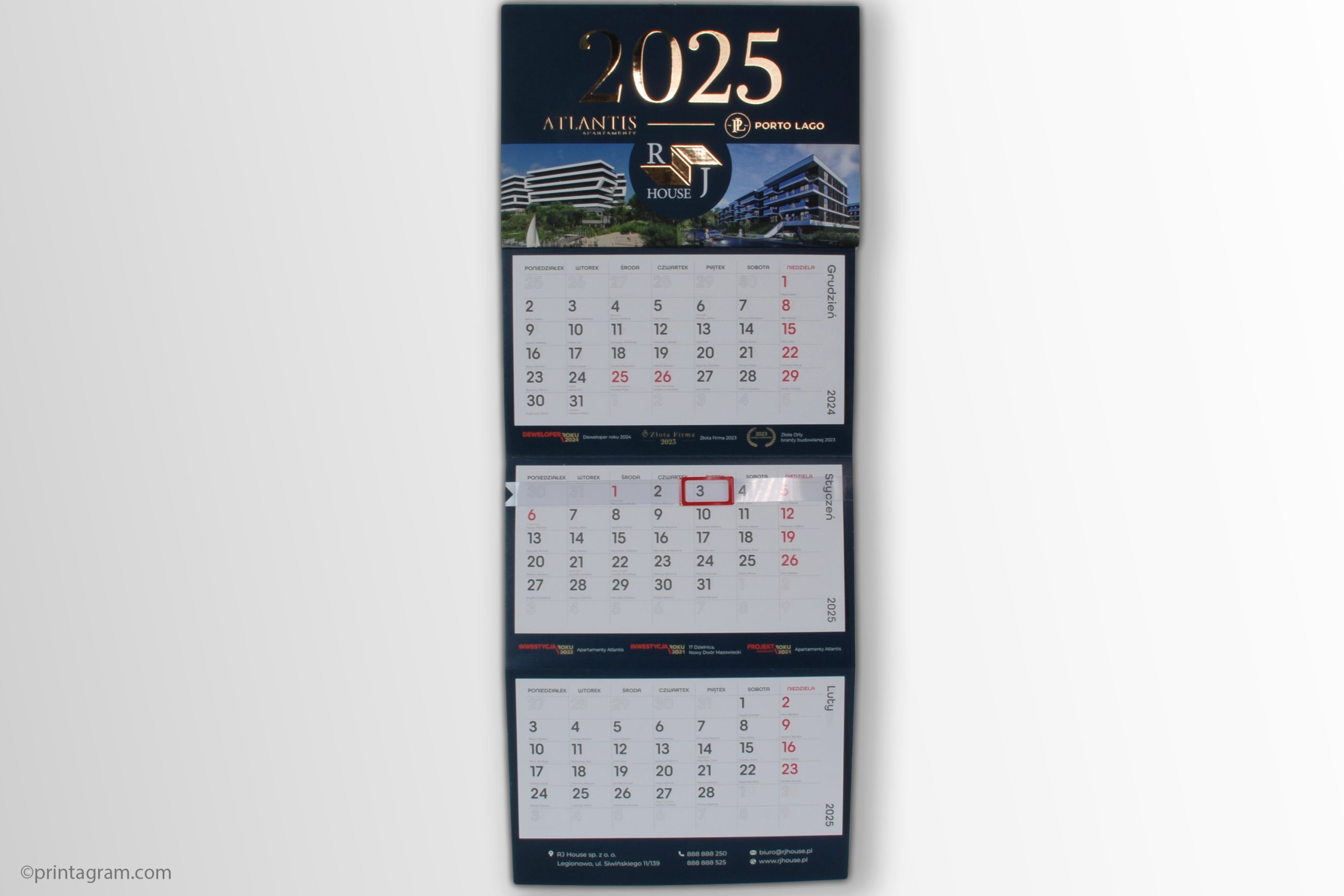 3-panelowe kalendarze z własnym personalizowanym nadrukiem. Ozdobny nagłówek z wypukłym złoceniem 3D i opcjonalnie z dodatkowym lakierem UV wypukłym. Laminowany folią soft-touch. 3 wydzierane kalendaria z podziałem na miesiące.