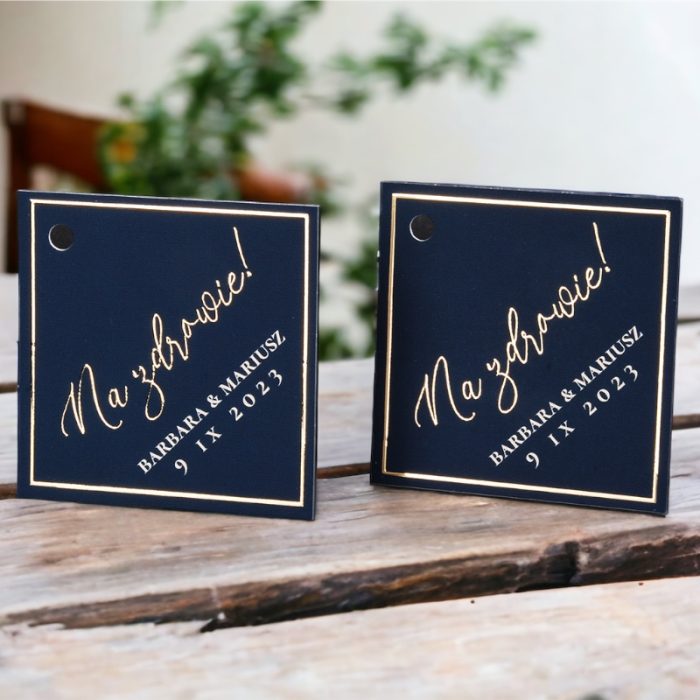 Metki z folią wypukłą metaliczną o gramaturze 350, pełnokolorowe, laminowane folią mat standard lub soft-touch (miłe w dotyku). Opcjonalnie lakier UV wypukły.